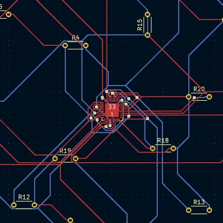 KiCAD + Freerouting, I manually created a nonsense circuit schematic, placed the components in their positions more or less randomly, then let the auto routing do its thing to draw the copper traces. Been meaning to do this for a while and definitely some tweaks to be done. Such as randomly generating the components, connections, and positions and setting more sensible design rules for pen plotting. And not starting with a 5x5 mm central part where all the connections will get bulked up!