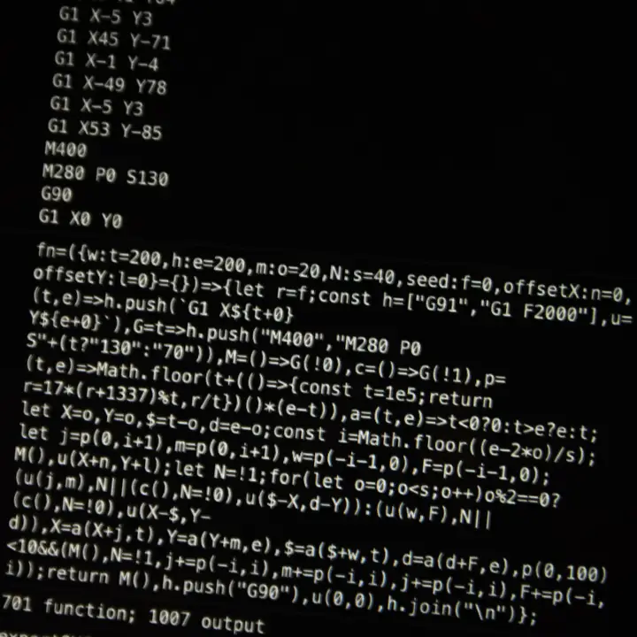 These are 6 outputs from a 701-byte (minified with terser) JavaScript function, which generates GCode commands to control the pen plotter. I manually adjust the number of lines given as a parameter, so that the GCode it prints also stays below 1024 bytes. I used mostly continuous lines to reduce the number of pen lift commands, and integer coordinates and relative positioning to reduce the number of digits printed.