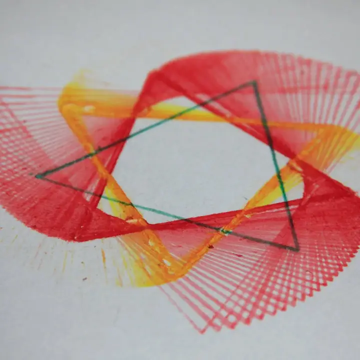 Rotated triangles in magenta, yellow, and cyan making an incomplete spiral pattern. The pen has scratched the paper and stopped writing halfway through the yellow layer. Next time (with a new nib?) I'll have to make sure to have fewer overlapping lines...