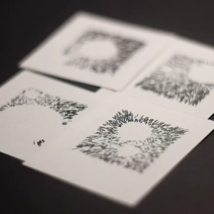 Here I define two circles with a function that, given a coordinate pair, returns a positive distance from the shape outline for any point outside the circle, and a negative number for any point inside. The two results are multiplied together, giving something like the XOR of the two shapes. I then use rejection sampling (more likely to select points far away from the shape, and never inside) and for each selected point calculate the gradient using the Sobel operator by comparing against nearby points.