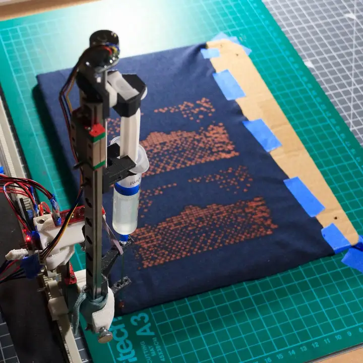 Finally finished my motorised syringe attachment idea for this! The picture is a variation of my #genuary progress bar piece, generating a sunset scene and representing it as large dithered pixels. I thought it would go white though but I'm very much not a chemist!