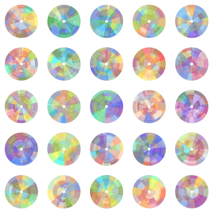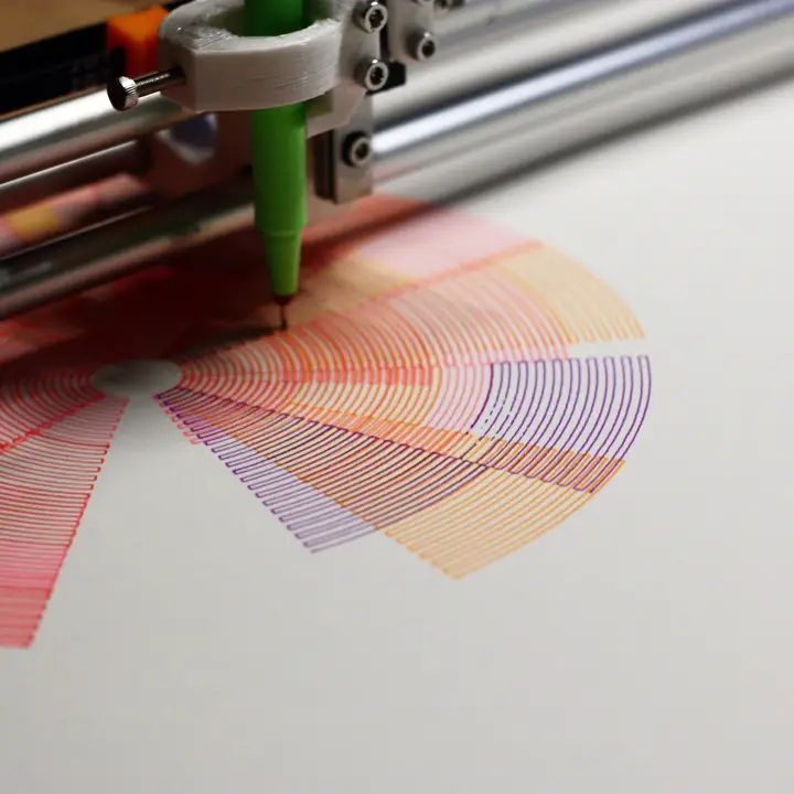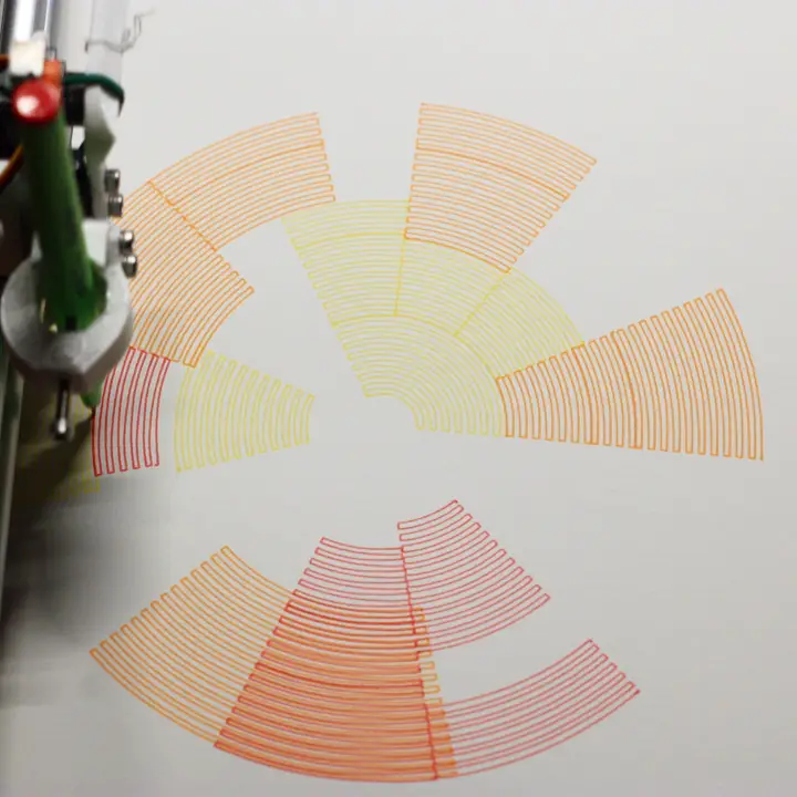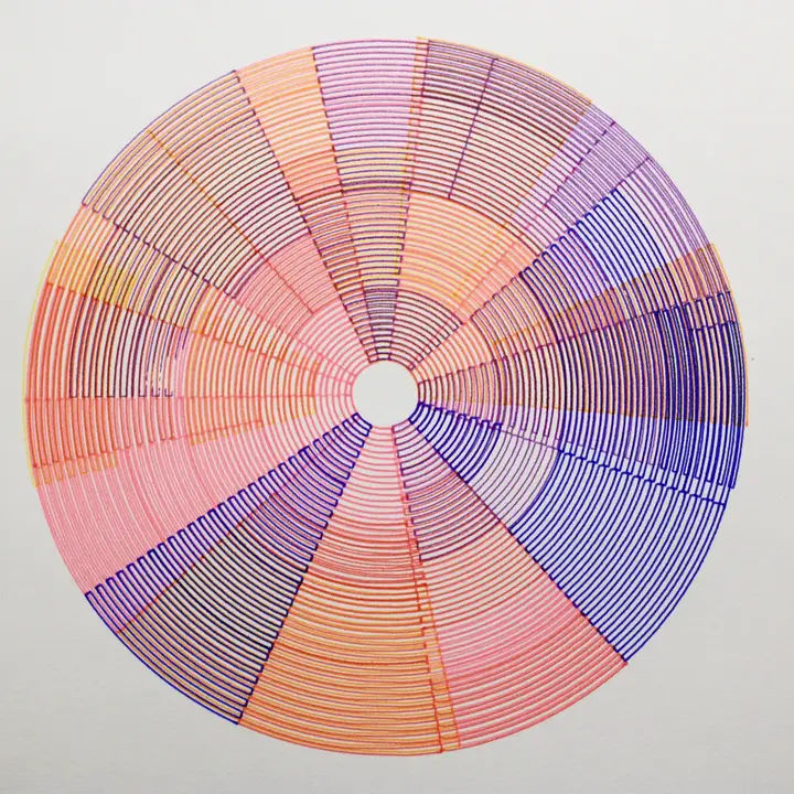 Emerging colours from overlapping lines drawn with eight fineliner pens on white paper. The drawing is generated as three overlaid segmented circles, with each segment assigned a pen colour and a fill density.