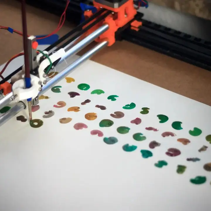 Random arcs, dipping into a random one of three colours on a palette to the side before each one, leading to increasing mixing and eventually running dry (until I refilled the paint).